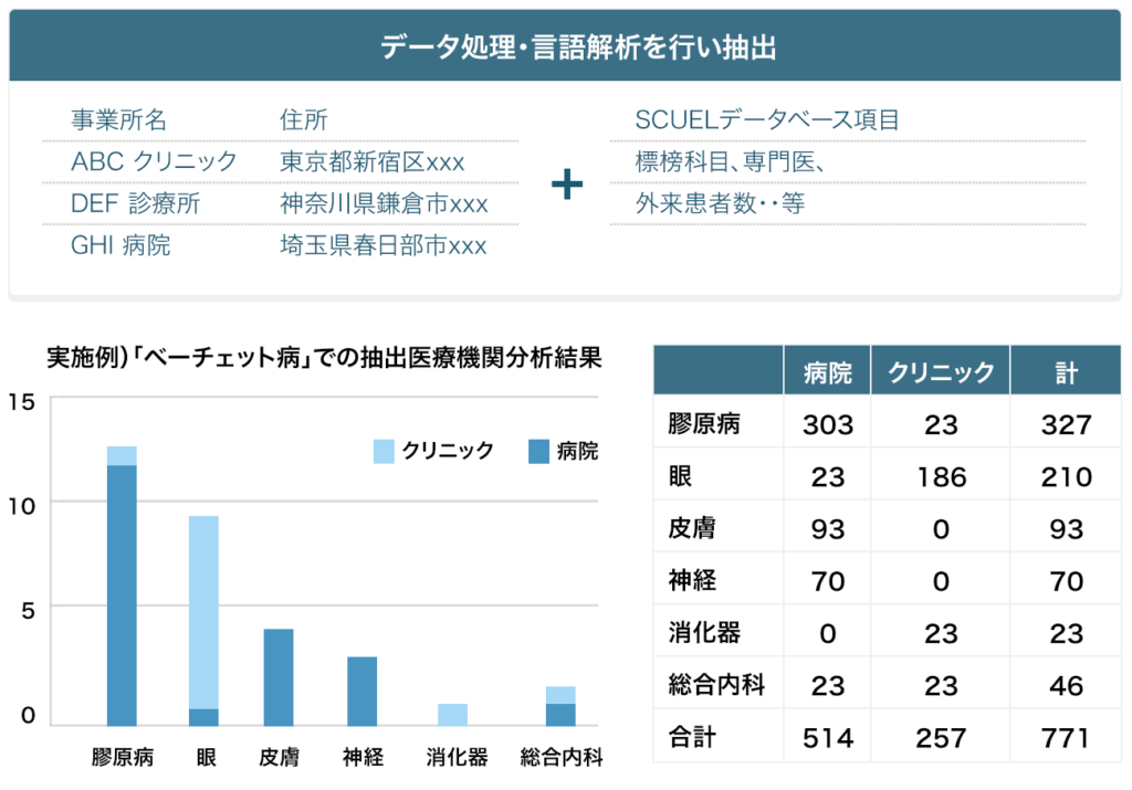 当社は、SCUELデータベースとデータ処理技術を組み合わせることで、難病・希少難病の診療に関心のある病院・診療所の候補を抽出することを可能としました。SCUEL RD-RESEARCHの提供を通じて、希少疾患・難病診療に関心のある医療機関の情報を提供し、1人でも多くの医師に希少疾患・難病に関する医薬品情報を届けることで希少疾患・難病患者を少しでも早期に治療に繋げることを目指します。
