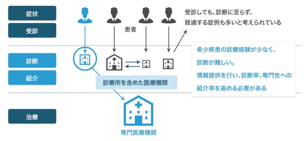 希少疾患・難病患者を少しでも早期に治療へつなげる為には、医薬品メーカーは、診療所を含めた広範囲の医療機関・医師に対して情報提供を行う必要があります。