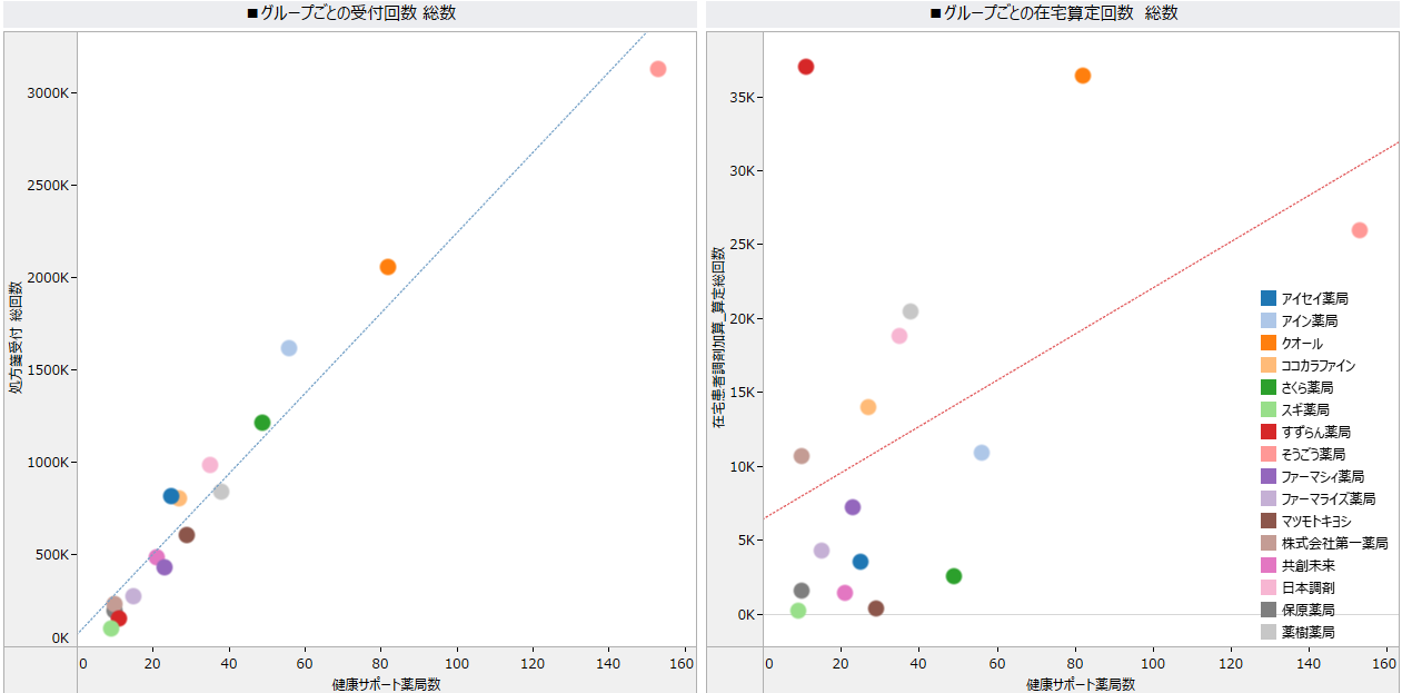 名称でグループ化した薬局について、処方箋の受付回数の総数と在宅調剤の総回数を確認。健康サポート薬局数に対して、処方箋受付回数をプロットすると、ほぼ正の相関。