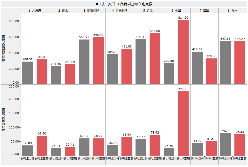 在宅調剤を行う体制がある保険薬局で、健康サポート薬局と 健康サポート薬局以外での1店舗あたりの患者数や算定状況は、中国厚生局エリアを除き大きな差は無かった。(2019年度1年間の実績を元にグラフ化)